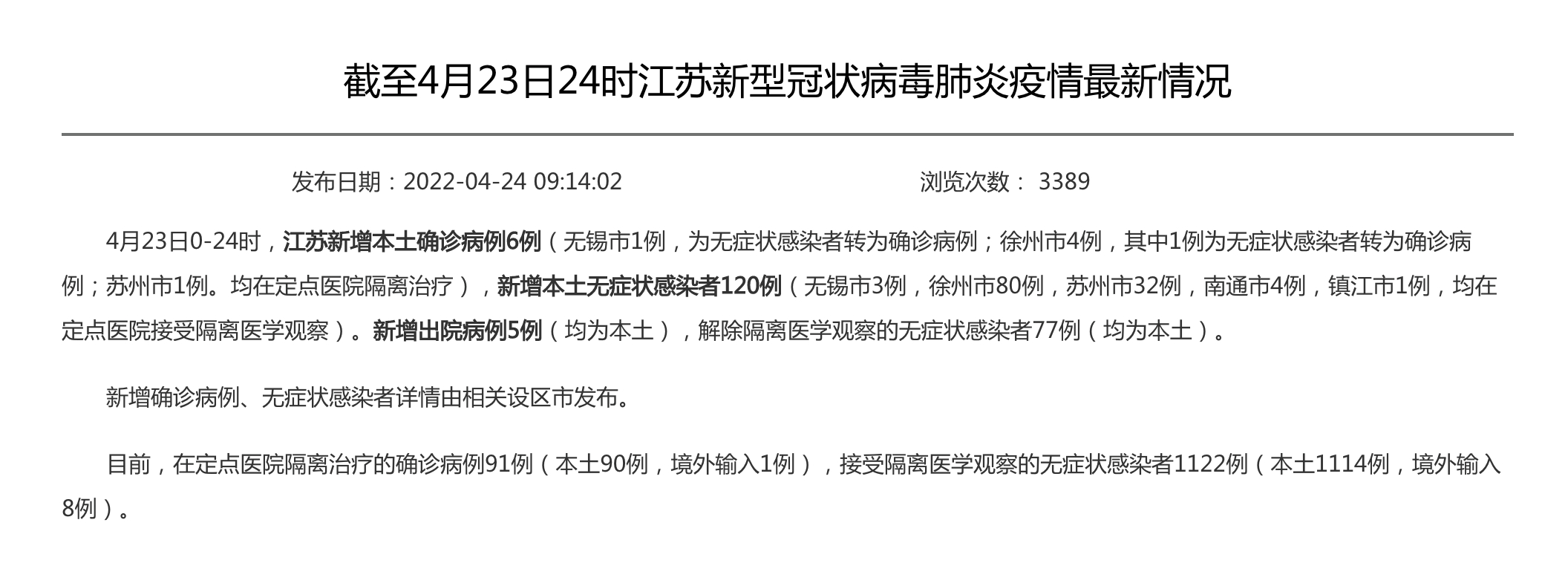 2022年4月23日,江苏方面报告了本土确诊病例6例,同时还报告了无症状感染者120例,无锡有1例是从无症状转为确诊,徐州的4例当中有1例会有同样的转归情况,苏州有1例,这126个数字分布在全省的定点医院,在全省每一张病床前面都有穿着防护服的护士以记录体温为工作内容。